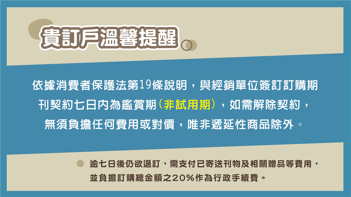5. 簽訂訂購契約/收執遞延性商品逾7日後仍欲退訂出版之刊物時,貴訂戶(消費者)均應支付經銷商承辦企業社贈品(市價)之費用,及已寄送之週刊之各期費用,並酌收訂購總金額之20%作為經銷單位之行政手續費。