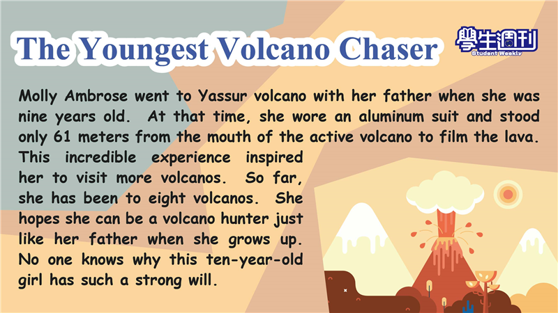 莫莉.安布羅斯11歲時和她父親一起去了伊蘇爾火山。那時,她穿著鋁製衣服,而且站在距離活火山只有61公尺的地方拍攝熔岩。這個難以置信的經歷激勵她去拜訪更多的火山。目前,她已經去過九座火山。她希望她長大後可以像她父親一樣成為一名火山獵人。沒有人知道為什麼這個十歲的女孩會有如此堅強的意志。