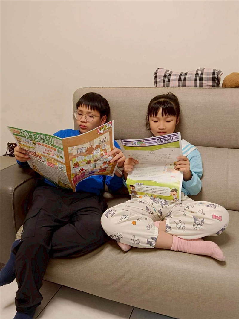 學生週刊成了我們一家人共讀的刊物,有時候會一起「動腦找一找」;討論「動物小王國、寶貝植物園」;和分享「生活小百科」;兄妹倆也會針對美語的部分練習發音和背單字;「漫畫百寶袋」更是哥哥最期待的單元;妹妹則喜歡挑戰「數學王國」和「小小畢卡索」。總之包羅萬象的文章,常常成為我們一家人茶餘飯後的聊天內容。坦白說我家老大正處於青春期,有稍稍的叛逆、但又礙於必須被爸媽管教的矛盾心理,「學生週刊」成了親子間的橋樑,好像又把我們之間的距離拉近了一些。