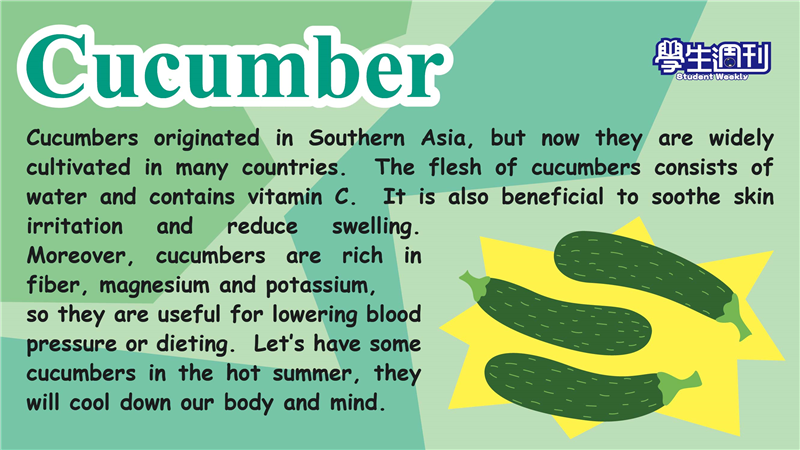 小黃瓜原產於南亞,但如今它們已被廣泛種植在許多國家。小黃瓜的果肉含有水分與維他命C。它們能緩和皮膚發炎,也有助於消腫。除此之外,小黃瓜還富含纖維質、鎂、鉀,因此它們也有助於降低血壓和減肥。在炎熱的夏天裡來點小黃瓜吧!它們能讓我們的身心涼爽舒暢呢!