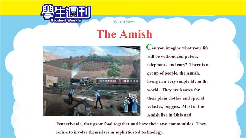 你能想像你的生活裡沒有電腦、電話和汽車,會是什麼樣子嗎?有一群人──艾美許人,在世界上過著非常簡單的生活。他們以樸素的衣著和特別的交通工具──輕便馬車而聞名。大多數的艾美許人住在俄亥俄州和賓州,他們一起耕種食物而且擁有他們自己的社區。他們拒絕涉入尖端的科技。