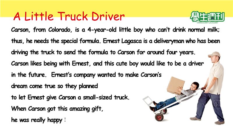 來自美國科羅拉多州的卡森是個四歲小男童,他不能喝一般的牛奶,因此,她需要特製的奶水。爾尼斯特‧拉格斯卡是位送貨員,他已經開著卡車遞送配方奶給卡森有四年之久。卡森喜愛跟爾尼斯特處在一起,而這個可愛的南還以後想當個司機。爾尼斯特的公司想讓卡森的願望成真,所以他們計畫讓爾尼斯特給卡森一臺小尺寸的卡車。當卡森拿到這令人驚奇的禮物時,他可是相當開心呢!