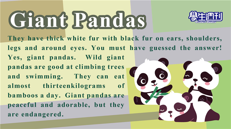 牠們有著厚厚的白色毛皮,耳朵、肩膀、腿部以及眼睛周圍則是黑色的。你一定已經猜到答案了吧!沒錯,就是大熊貓。野生的大熊貓很擅長爬樹和游泳。牠們一天幾乎可以吃下將近十三公斤的竹子。大熊貓性情溫和、外表可愛,但牠們目前正面臨瀕臨絕種的危機。